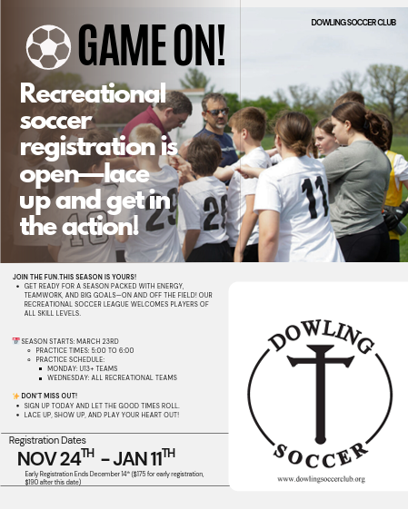 Please see the attached flyer for Dowling Club Soccer. Please click on the following link to register: https://www.dowlingsoccerclub.org/
